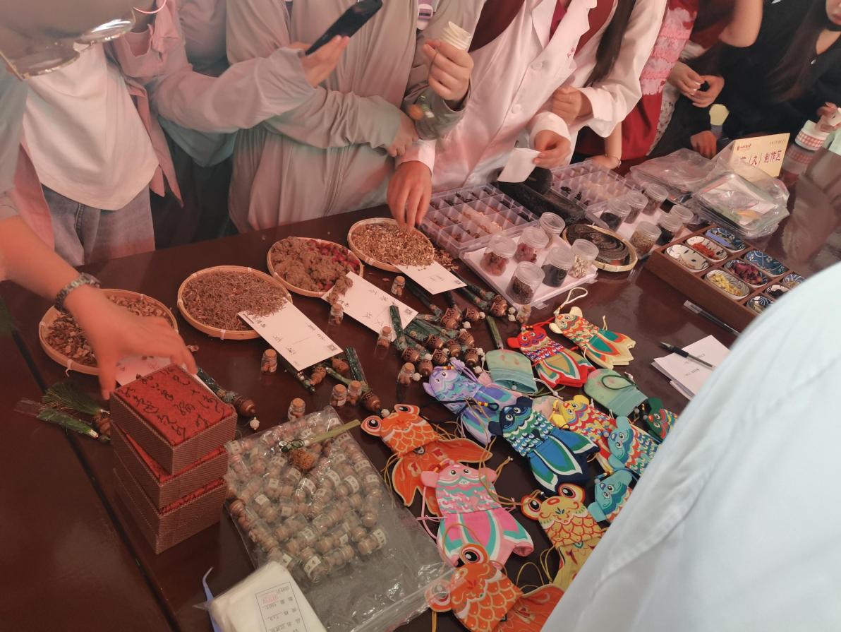 为了弘扬在端午节弘扬中医药文化,学院前期积极准备,在本次活动中设置六个展区。在中医特色疗法体验区,设置推拿、耳穴、艾灸三大项目。针灸推拿学会成员现场演示“骨正筋柔”手法,耳穴贴豆疗法为用眼过度的师生缓解疲劳,艾灸区则以《伤寒论》理论为指导,用陈艾驱寒除湿。在香囊展区,学生们可亲手制作艾草香囊,体验“衣冠疗法”的防疫传统,精致的文创设计让古老智慧以时尚形式走入日常生活。在中药制作区,赵启腾老师亲自指导,参与者亲手制作大山楂丸,体验“药食同源”的智慧;在药茶体验区,“清暑酸梅饮”“元气三宝茶”“桑杞乌发饮”,以茶为媒传递“调和阴阳”的养生哲学。 在中药标本展区,策划的数百种药材立体陈列,生动展现“本草纲目”的博大精深,并设置灯谜活动参与互动。