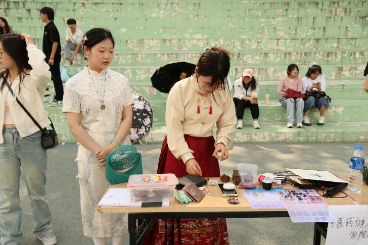 在活动的另一侧,我院学生手把手教大家做香囊,用"看颜色、闻味道、摸手感"的三步法,教大家挑薄荷驱蚊、陈皮理气的好药材,再用彩绳缠紧封口。在我院学子的引领下,同学们挑选了各种颜色和图案的布料,亲手制作出一个个充满个性的香囊。