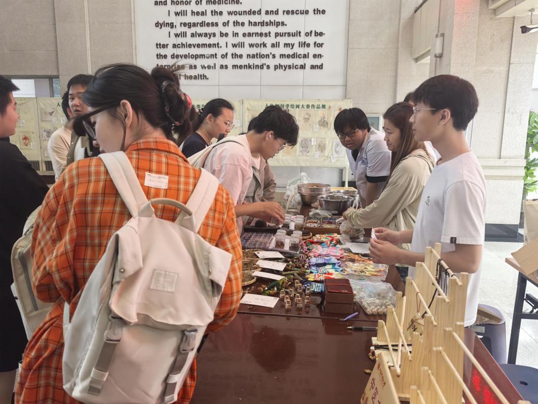 为了弘扬端午节中医药文化,学院前期积极准备,在本次活动中设置六个展区。在中医特色疗法体验区,设置推拿、耳穴、艾灸三大项目。由学院党委副书记、党员先锋岗白振军副教授指导学生现场演示“骨正筋柔”手法,耳穴贴豆疗法为用眼过度的师生缓解疲劳。在香囊展区,学生党支部党员先锋岗学生指导学生制作艾草香囊,体验“衣冠疗法”的防疫传统,精致的文创设计让古老智慧以时尚形式走入日常生活。在中药制作区,教工党支部书记赵启腾老师亲自指导,参与者亲手制作大山楂丸,体验“药食同源”的智慧;在药茶体验区,由教工党支部委员、系主任王政老师指导学生制作“清暑酸梅饮”“元气三宝茶”“桑杞乌发饮”,以茶为媒传递“调和阴阳”的养生哲学。 在中药标本展区,由教工党支部先锋党员夏晓艳博士策划的数百种药材立体陈列,生动展现“本草纲目”的博大精深,并设置灯谜活动参与互动。