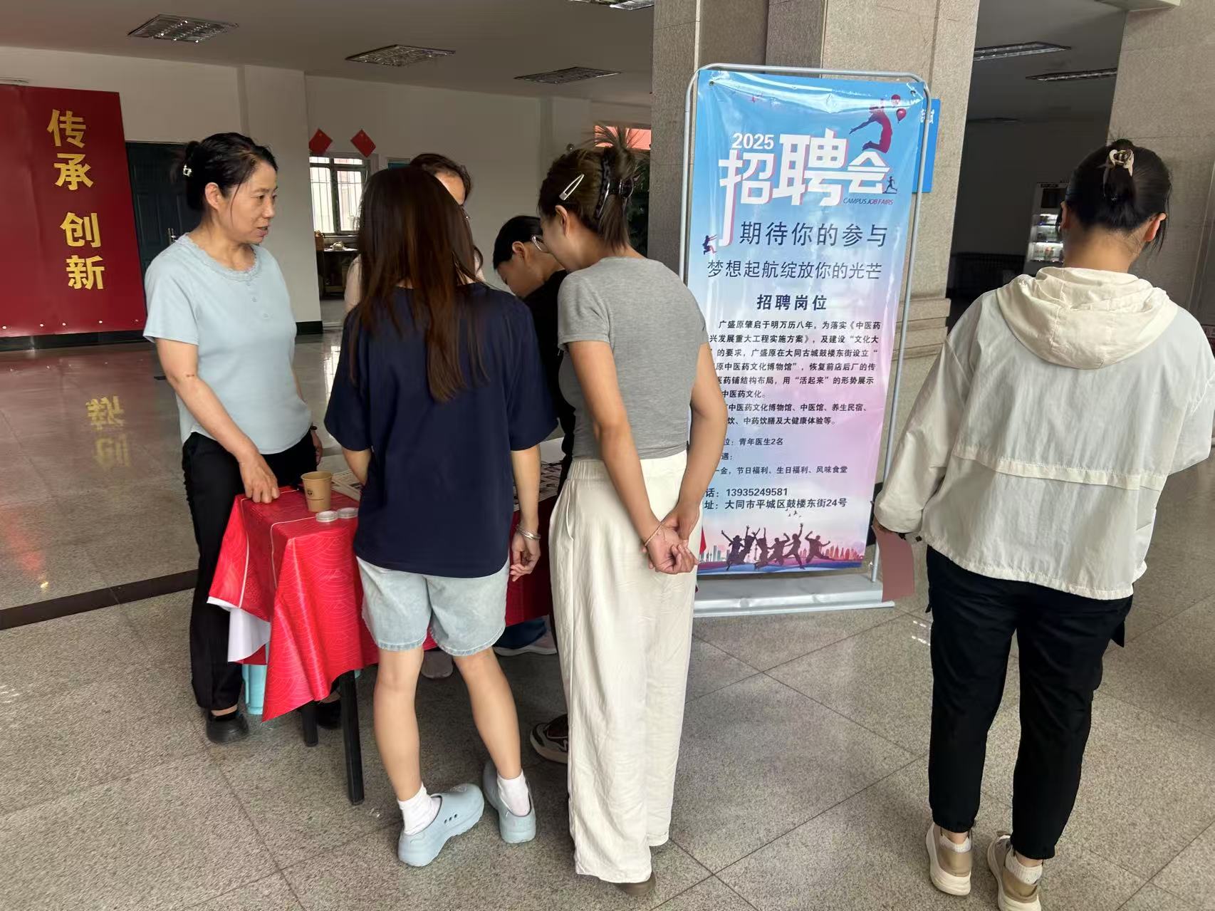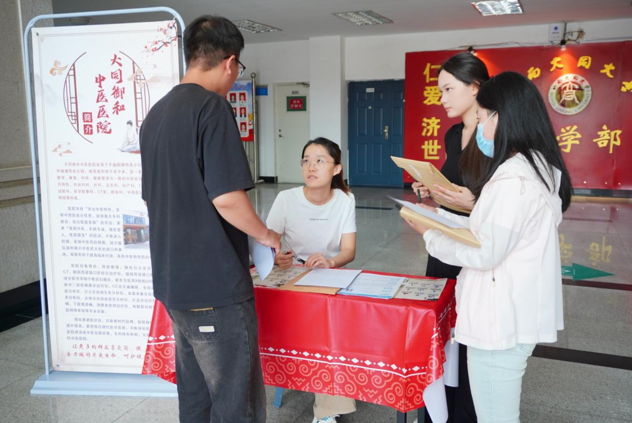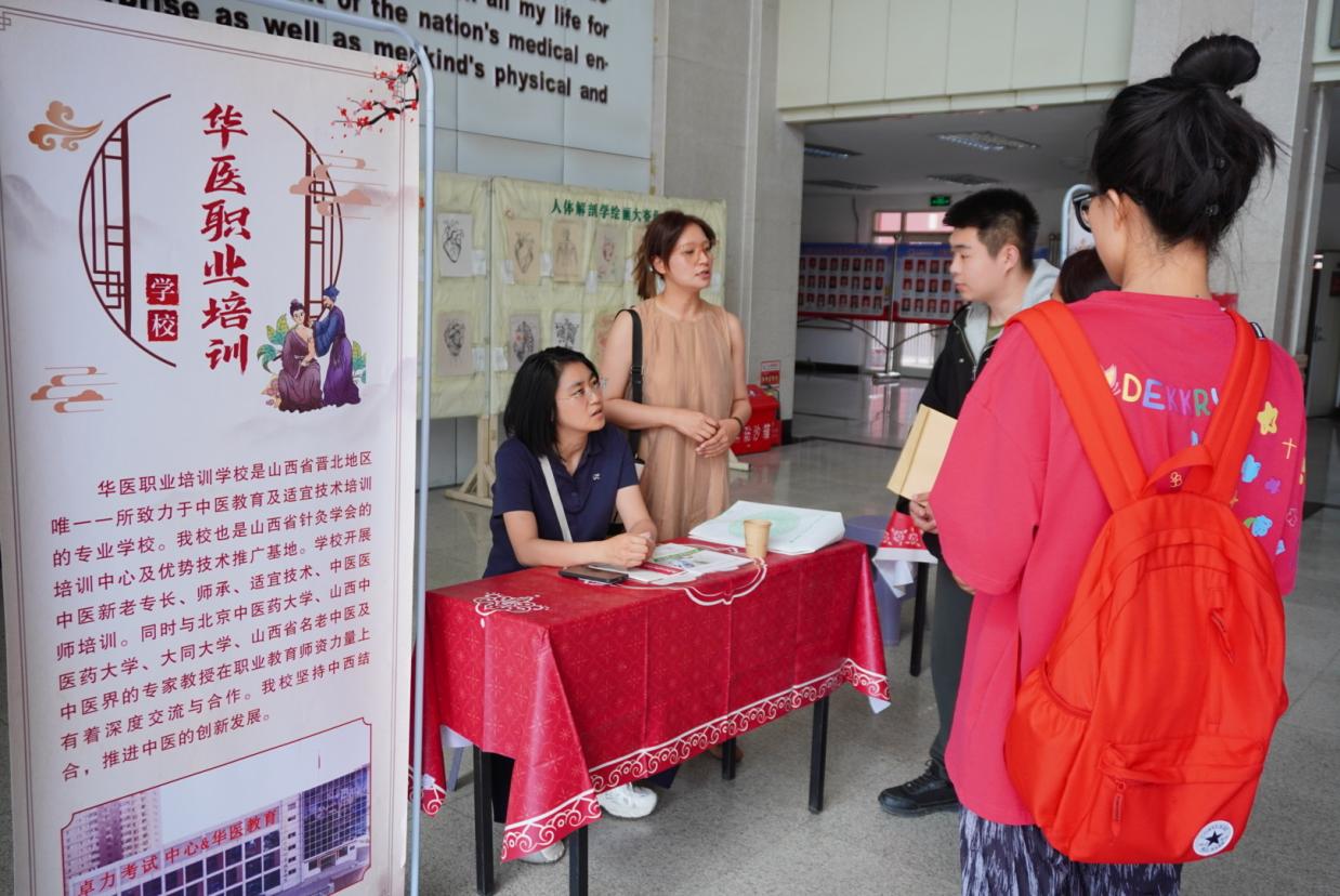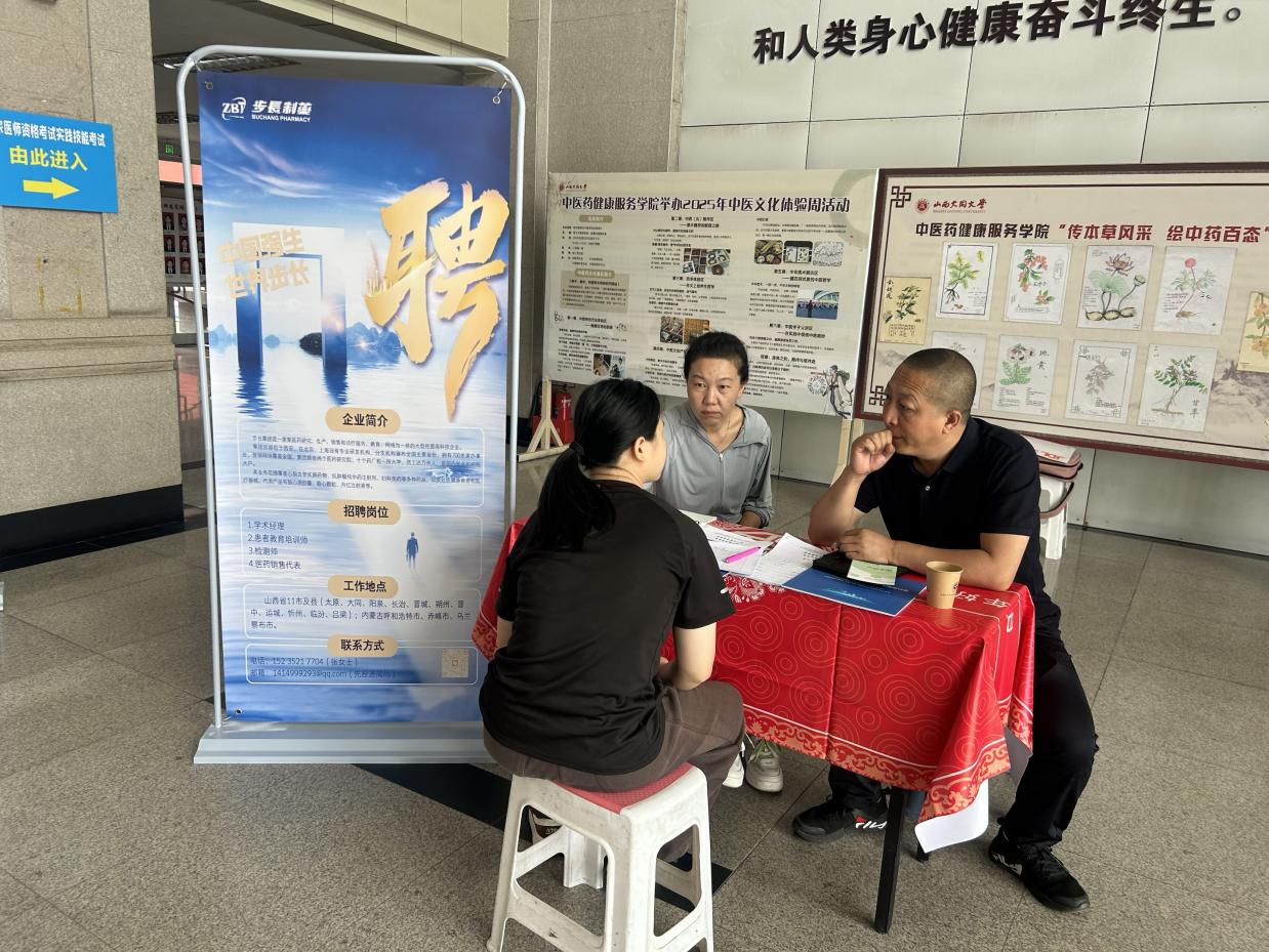 “大同御和中医医院”、“广盛原”、“步长制药”、“华医堂”、“华医职业培训”5家企业依次设展,各展位通过宣传海报、资料发放与现场讲解,详细介绍企业背景、招聘岗位与发展前景。“广盛原”围绕中医药文化博物馆建设,招聘青年医生,传承中医药经典;“华医堂”以千年中医智慧为依托,诚招擅长内、妇、儿科等领域人才,推广中医特色诊疗;“步长制药”聚焦医药研发、推广等环节,提供多类专业适配岗位。求职学生手持精心准备的简历,穿梭于展位间,积极与企业HR交流,询问岗位要求、职业发展路径等细节。企业代表耐心解答,结合中医药行业趋势,为学生分析岗位适配性与成长空间,现场互动氛围热烈。不少学生表示,招聘会让他们更清晰了解行业需求,也为求职增添信心;企业方也对学生专业素养给予肯定,收获多份优质简历。