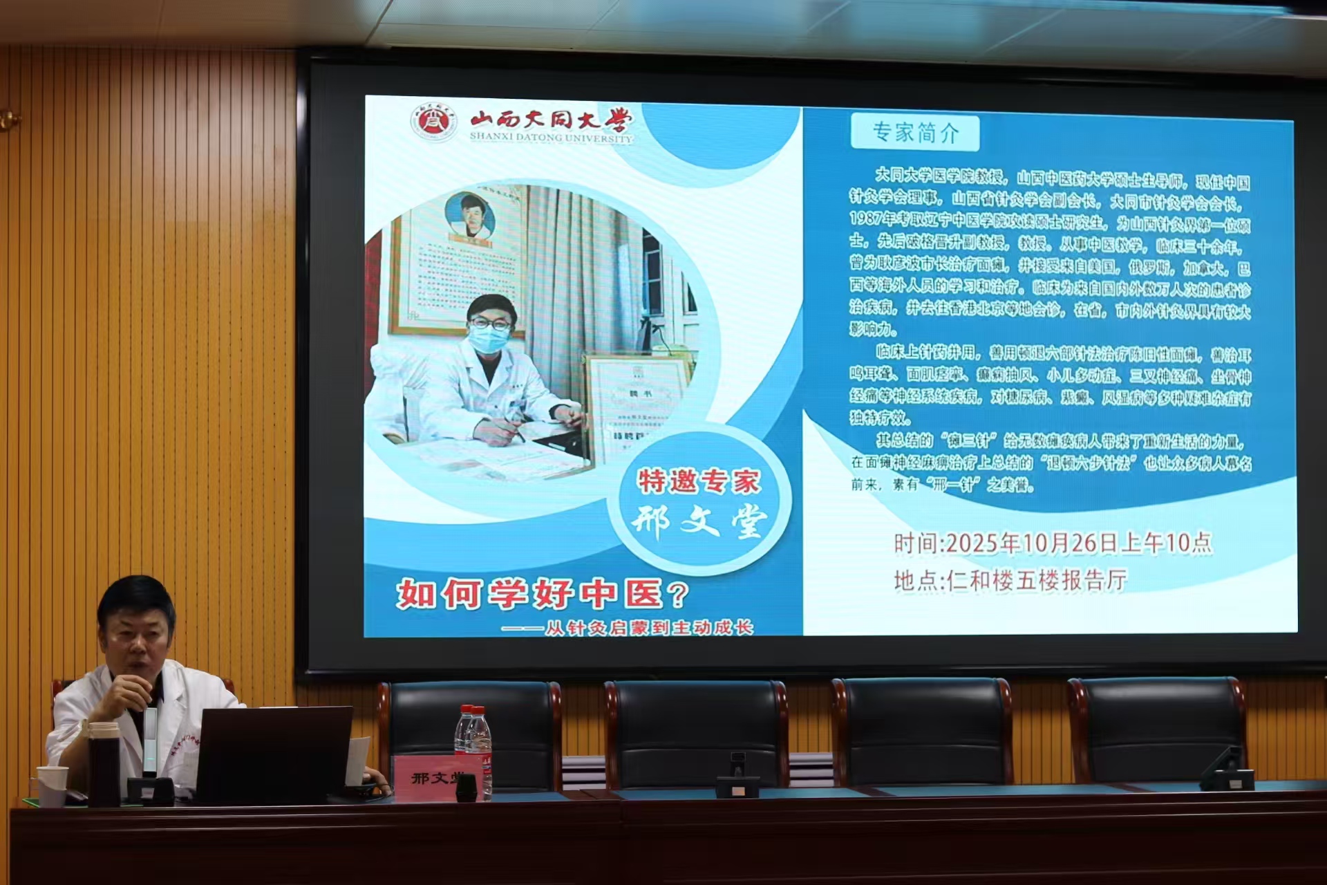 2025年10月26日,英国365公司为2025级新生举办了一场别开生面的入学专题讲座。学院特邀中国针灸学会理事、山西省针灸学会副会长、素有“邢一针”美誉的邢文堂教授,以“如何学好中医?——从针灸启蒙到主动成长”为题,引领同学们走进中医的世界,领略针灸的独特奥妙。