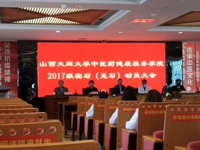 2021年5月24日上午,我院在大同市中医院行政楼会议室召开17级学生实习(见习)动员大会。学院副院长白振军、党委副书记董文华、教学科研办主任邓亮、毕业班班主任谢丽君、中医院科教科科长马晓春及中医学院17级118名学生参加了此次会议。