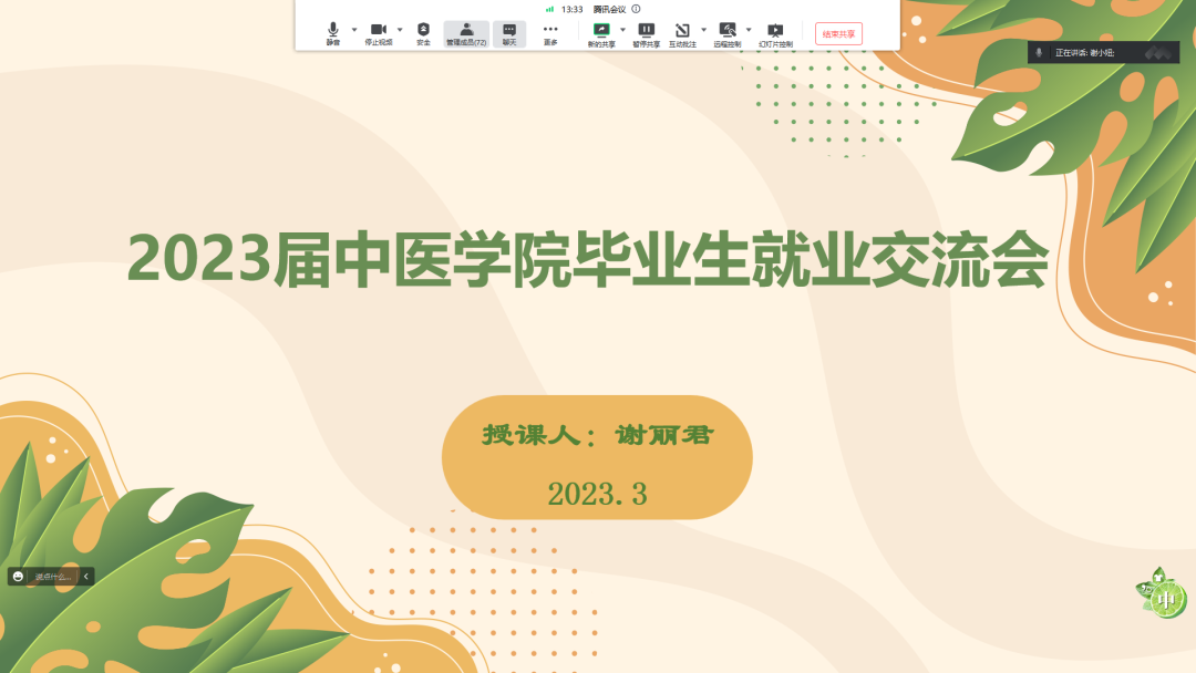 会议尾声,谢老师祝福所有23届中医学子在祖国中医药事业中绽放绚丽之花。指导会秉持学院“以学生为中心”的理念,为毕业生在择业的时候提供了切实有效的帮助,希望中医学子彰显中医大医精诚、守正创新的精神,谱写新时代新征程的青春之歌。
