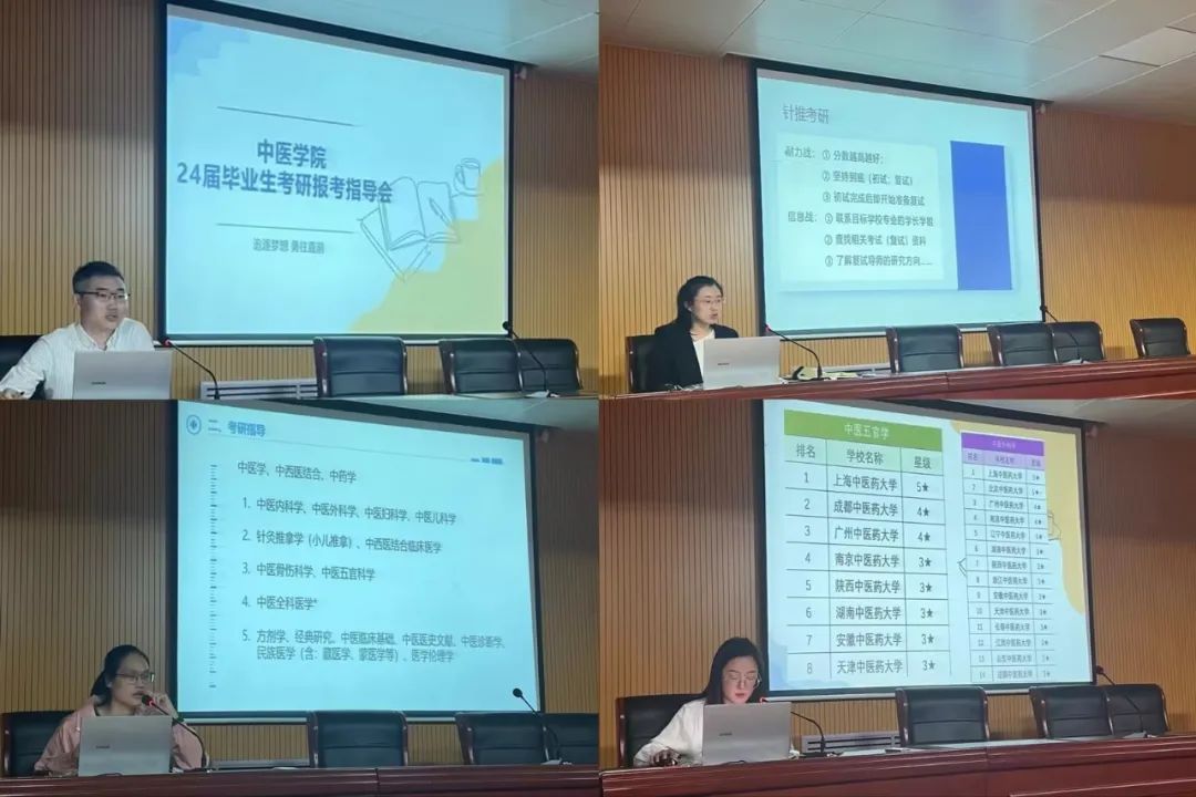 会上,李扬依据2022年科教评教网发布的中医内科院校排名,介绍了中医内科学的就业需求、就业形势、收入及行医环境等;还通过自身及其同学的考研经历引导学生们更详细的了解报考技巧。陈洁围绕两个关键词:“耐力战和信息战”,强调考研心态和信息收集的重要性。林淑霞从高校人才网信息入手,分析全国综合性大学中医学专业的报考形势,并对中医学专业的学硕和专硕的职业发展趋势进行了全面讲解。最后,苏纳就中医外科学的就业环境、方向、收入进行了详细讲解。
