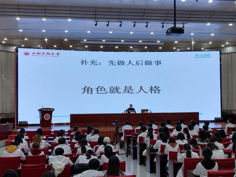 我院于11月5日上午九点在慎思楼报告厅举办2023 年新生系列教育——中华礼仪文化培训。辅导员杜婧主持会议。学院党委副书记董文华、副院长李亮、院团委书记力妙芳、学院青年教师及2021—2023级全体学生参加会议。