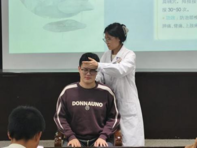 接着陈雯煜同学从推拿的角度为大家阐释了中医美容的另一种方法,使同学们受益良多,进一步丰富了中医美容的内涵,通过运动七情、饮食等多维度的补充,使得美术学院的学生们对中医美容的效果感到惊叹,并且对中医的信任感也随之增强。