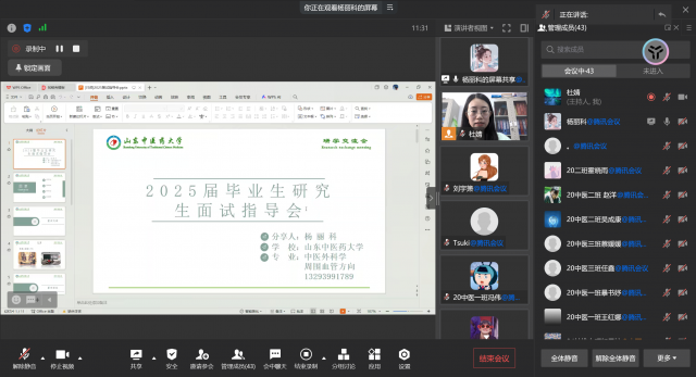 为助力2025届考研学子高效备战研究生考试复试,掌握复试技巧,提高复试及调剂成功率,3月2日上午10点,中医药健康服务学院通过腾讯会议的方式举办考研复试指导会。学院团委副书记杜婧主持会议,2024届考研学子参会。本次会议邀请优秀校友、在读研究生5人,共同探讨和分享复试经验和技巧。