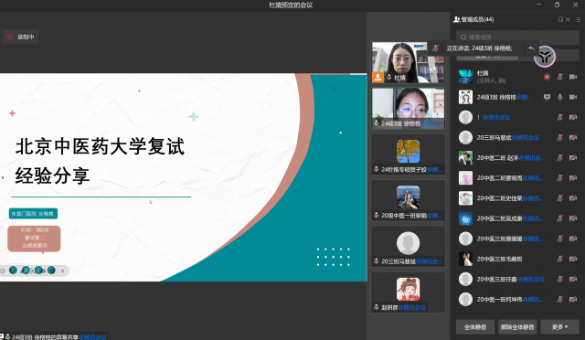 为助力2025届考研学子高效备战研究生考试复试,掌握复试技巧,提高复试及调剂成功率,3月2日上午10点,中医药健康服务学院通过腾讯会议的方式举办考研复试指导会。学院团委副书记杜婧主持会议,2024届考研学子参会。本次会议邀请优秀校友、在读研究生5人,共同探讨和分享复试经验和技巧。