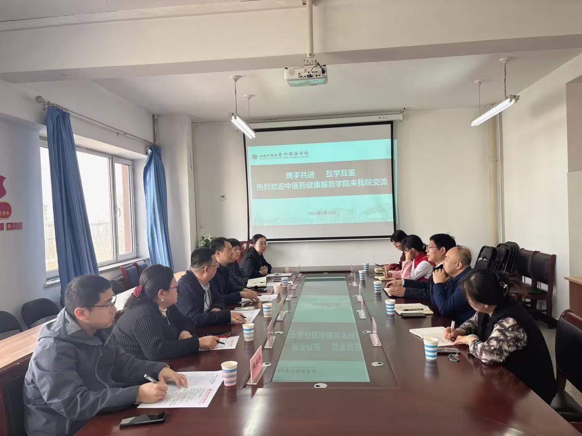 3 月 26 日上午,为了落实校党委“贯彻落实年”的要求,由学院党委负责人白振军带队前往外国语学院开展交流学习,旨在向兄弟学院借鉴党建与业务融合的先进经验和做法。党委副书记董文华、中医系主任王政、团委书记力妙芳、团委副书记杜婧、教工党支部书记赵启腾参加本次活动。